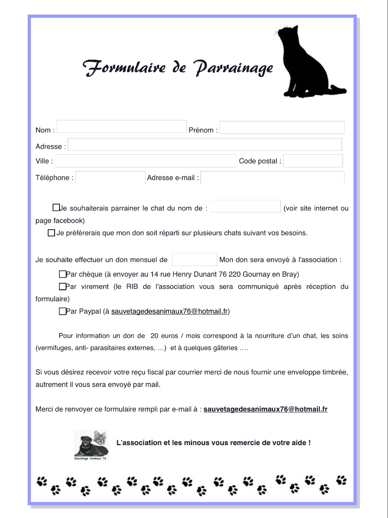 Le parrainage, c’est la mise en place d’un versement mensuel à l’association au profit d’un animal dit « à parrainer ». Il permet la prise en charge sur du long terme des frais vétérinaires de certains animaux qui n’ont pas trouvés de familles adoptives et demeurent dans notre local.